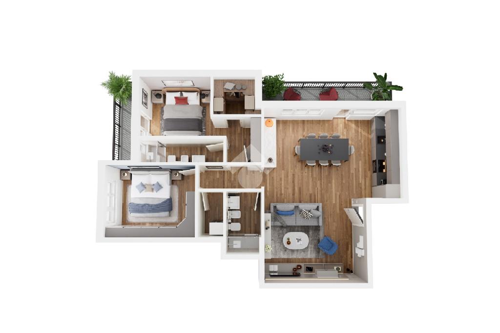 Internamente l'immobile si compone di ambienti moderni e luminosi: un ingresso che conduce ad un soggiorno doppio con cucina a vista e accesso al balcone abitabile; una camera padronale dotata di bagno en suite, cabina armadio ed accesso al secondo balcone; una camera matrimoniale; un bagno principale ed un ripostiglio. Ottima la divisione fra la zona giorno e la zona notte.