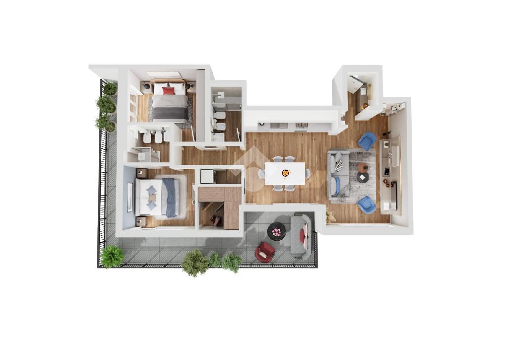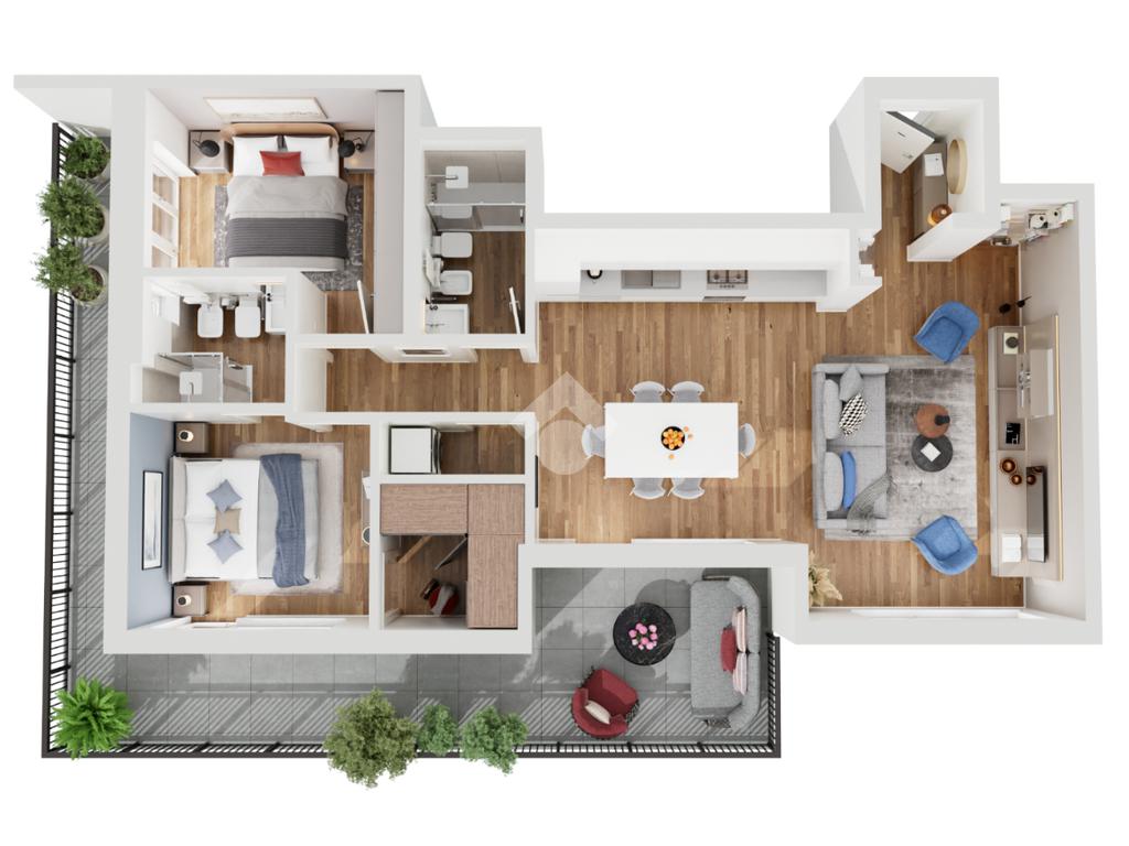 Internamente l'immobile si compone di ambienti moderni e luminosi: un ingresso che conduce ad un soggiorno doppio con cucina a vista e ripostiglio; una camera padronale dotata di bagno en suite e cabina armadio; una seconda camera matrimoniale ed un bagno principale. All'esterno un ampio terrazzo abitabile di 30 mq (accessibile mediante il soggiorno e le due camere) conduce ad un bellissimo giardino di 55 mq. Ottima la divisione fra la zona giorno e la zona notte.